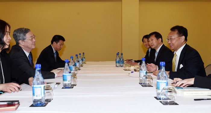 (서울=포커스뉴스) 2016년 IDB 연차총회 참석차 바하마 낫쏘를 방문중인 유일호 부총리 겸 기획재정부 장관이 11일(현지시간) 멜리아 호텔에서 저우 샤오촨 중국 인민은행 총재와 면담을 갖고 있다. <사진제공=기획재정부>