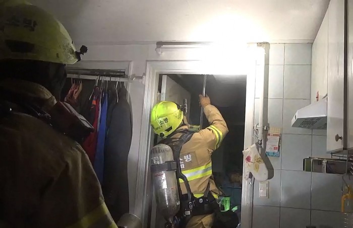 소방당국은 화장실 환풍기에서 전기합선으로 불이 시작된 것으로 보고 정확한 원인을 조사 중이다.11일 오후 10시 28분쯤 서울 송파구 거여동의 한 건물 4층 주택에서 불이 나 출동한 소방관들이 불을 끄고 있다. <사진제공=서울 송파소방서>