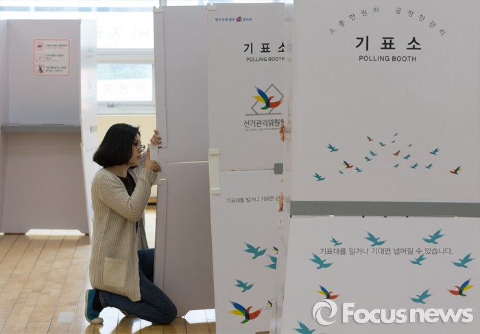 (세종=포커스뉴스) 20대 국회의원 선거를 하루 앞둔 12일 오전 세종시 조치원읍 세종시민체육관에 마련된 투표소에서 관계자들이 투표소 준비를 하고 있다.