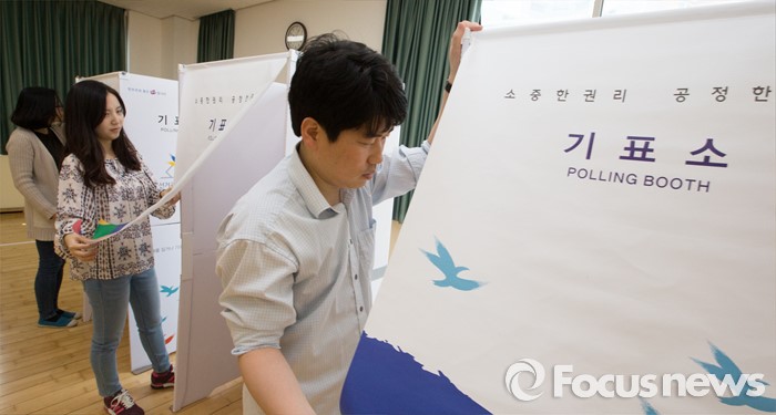 (세종=포커스뉴스) 20대 국회의원 선거를 하루 앞둔 12일 오전 세종시 조치원읍 세종시민체육관에 마련된 투표소에서 관계자들이 투표소 준비를 하고 있다.