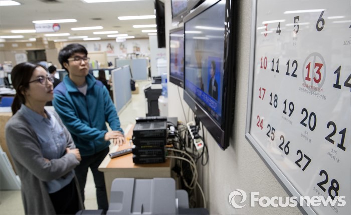 (과천=포커스뉴스) 2016 제20대 국회의원선거를 하루 앞둔 12일 오전 경기도 과천시 중앙선거관리위원회에서 직원들이 선거 관련 뉴스를 시청하고 있다.