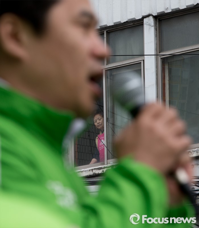 (서울=포커스뉴스)12일 오전 서울 성동구 금장시장 앞에서 한 시민이 서경선 중구성동구갑 후보의 유세연설을 바라보고 있다.