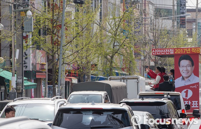 (안산=포커스뉴스) 4.13 총선을 하루 앞둔 12일 오전 경기 안산시 한대앞역 인근에서 홍장표 새누리당 안산시상록구을 후보 지원유세에 나선 김무성 대표가 유권자들의 지지를 호소하고 있다.