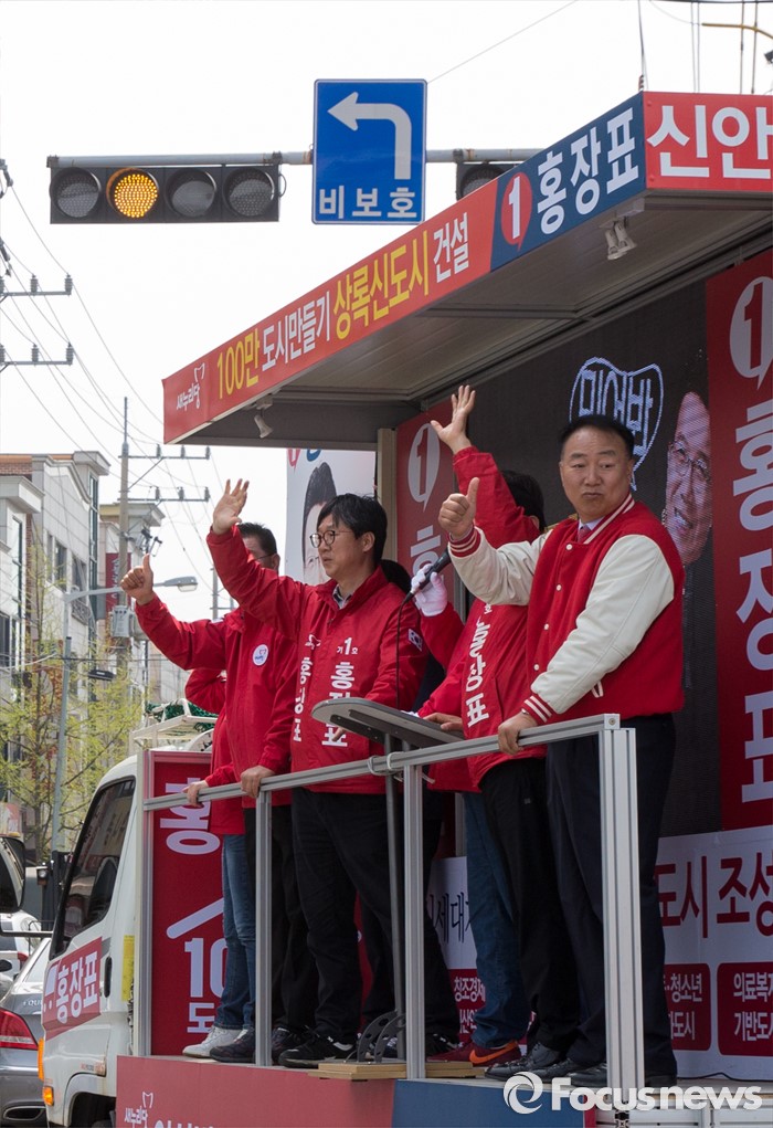 (안산=포커스뉴스) 4.13 총선을 하루 앞둔 12일 오전 경기 안산시 한대앞역 인근에서 홍장표 새누리당 안산시상록구을 후보 지원유세에 나선 김무성 대표가 유권자들의 지지를 호소하고 있다.