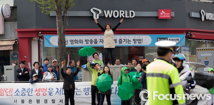 (서울=포커스뉴스) 12일 오전 서울 은평구 불광역에서 안철수 국민의당 상임공동대표와 고연호 은평구을 후보 지지자들이 환호하고 있다.