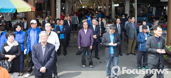 (청주=포커스뉴스) 국회의원 선거를 하루 앞둔 12일 오전 충북 청주 상당구 육거리시장 앞에서 시민들이 김종인 더불어민주당 대표의 지원유세를 바라보고 있다.