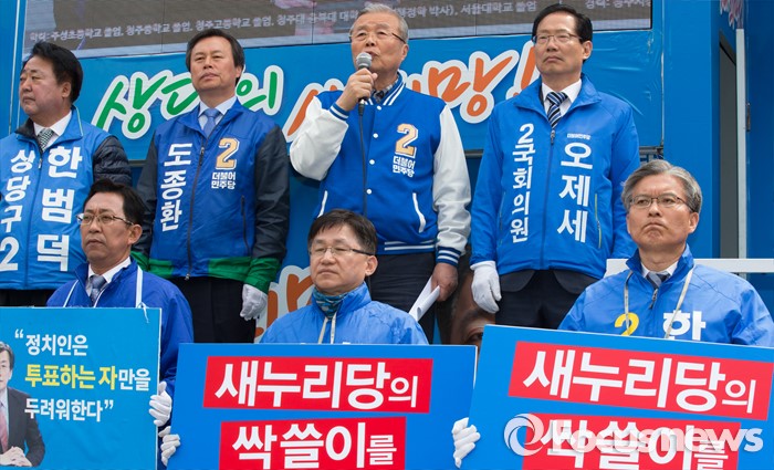 (청주=포커스뉴스) 국회의원 선거를 하루 앞둔 12일 오전 충북 청주 상당구 육거리시장 앞에서 김종인 더불어민주당 대표가 청주지역 후보의 지지를 호소하고 있다.