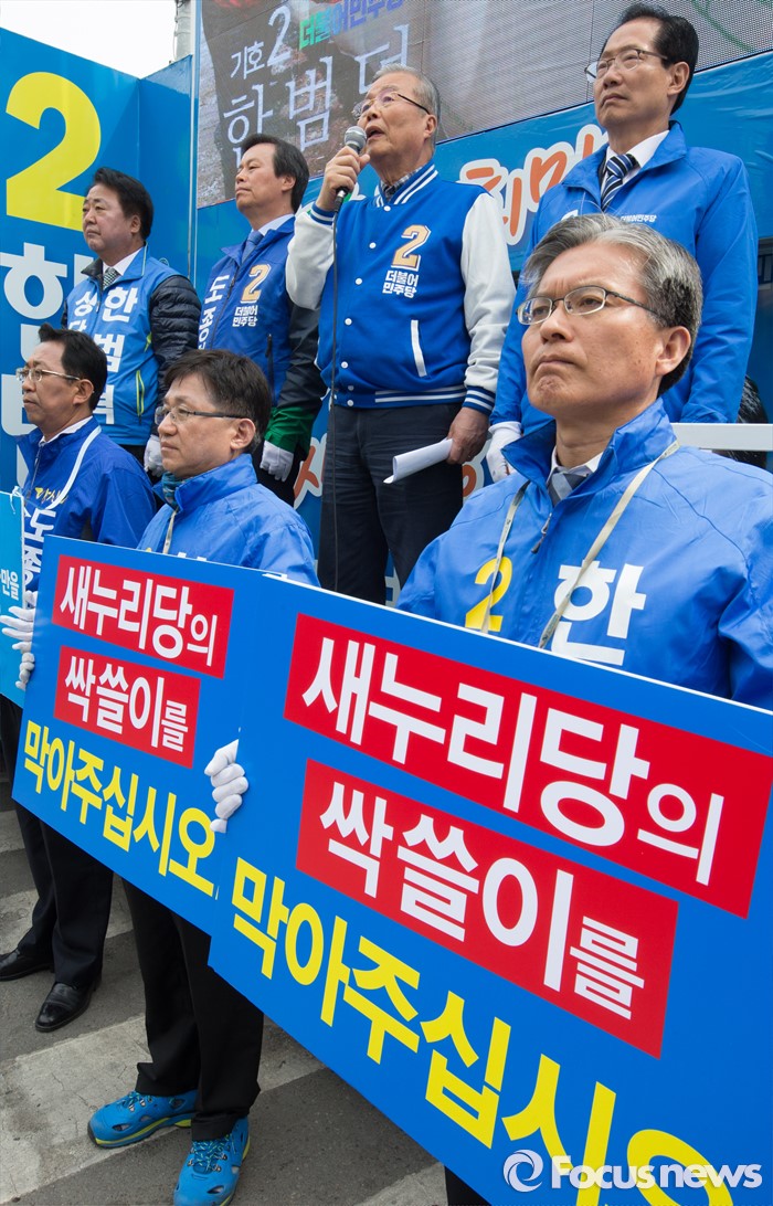 (청주=포커스뉴스) 국회의원 선거를 하루 앞둔 12일 오전 충북 청주 상당구 육거리시장 앞에서 김종인 더불어민주당 대표가 청주지역 후보의 지지를 호소하고 있다.