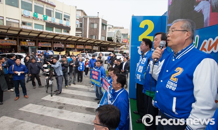 (청주=포커스뉴스) 국회의원 선거를 하루 앞둔 12일 오전 충북 청주 상당구 육거리시장 앞에서 김종인 더불어민주당 대표가 청주지역 후보의 지지를 호소하고 있다.