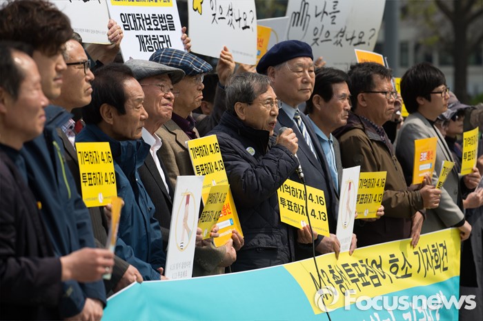 (서울=포커스뉴스) 제20대 국회의원 선거를 하루 앞둔 12일 오전 서울 광화문광장에서 2016 총선시민네트워크 회원들이 총선 투표참여를 호소하는 기자회견을 하고 있다.