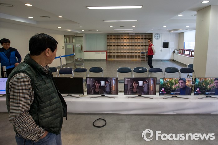 (서울=포커스뉴스) 제20대 국회의원선거를 하루 앞둔 12일 오전 서울 영등포구 새누리당사에서 관계자들이 선거상황실을 설치 하고 있다.