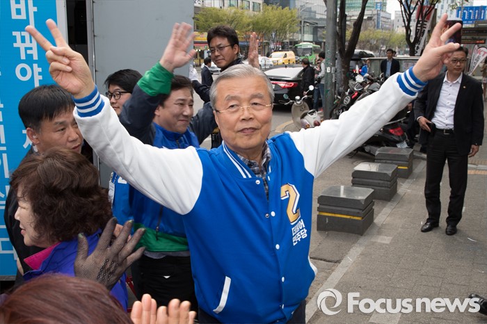 (서울=포커스뉴스) 2016 제20대 국회의원선거를 하루 앞둔 12일 오후 서울 동작구 노량진역 인근에서 김종인 더불어민주당 비대위 대표 겸 선대위원장과 김병기 동작갑 후보가 유권자들에게 지지를 호소하고 있다.