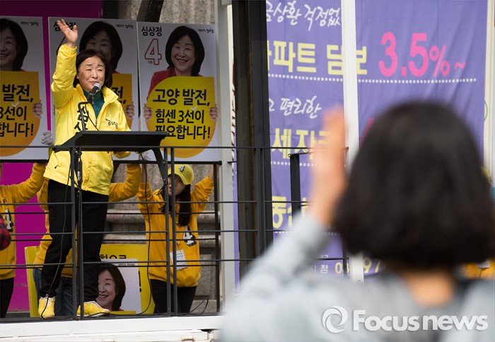 (고양=포커스뉴스) 제20대 국회의원 선거를 하루 앞둔 12일 오후 심상정 정의당 고양갑 후보가 경기 고양시 롯데마트 화정점 앞에서 유권자들에게 지지호소 하고 있다.