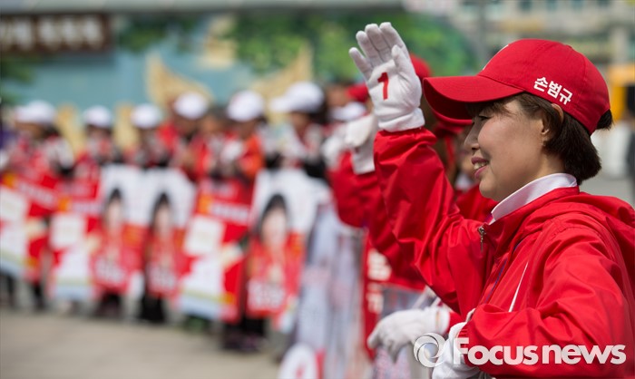 (고양=포커스뉴스) 제20대 국회의원 선거를 하루 앞둔 12일 오후 경기도 고양시 화정역 앞에서 손범규 새누리당 고양갑 후보 선거운동원들이 율동을 선보이고 있다.