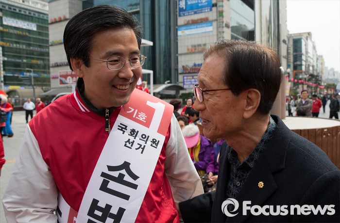(고양=포커스뉴스) 제20대 국회의원 선거를 하루 앞둔 12일 오후 경기도 고양시 화정역 앞에서 손범규 새누리당 고양갑 후보가 유권자와 대화하고 있다.