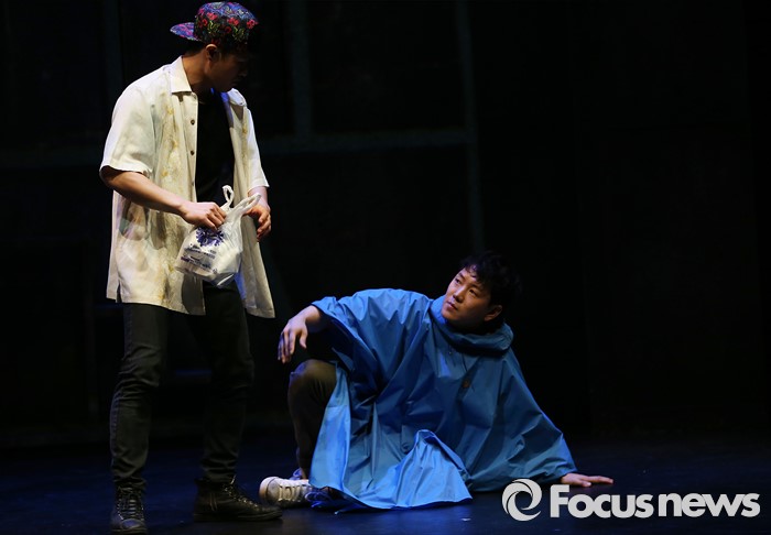 (서울=포커스뉴스) 12일 오후 서울 종로구 아트원씨어터에서 열린 연극 '지구를 지켜라' 프레스콜에 참여한 배우 정원영(오른쪽)이 주요장면을 시연하고 있다.