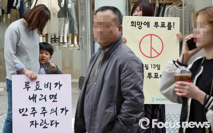 (청주=포커스뉴스) 12일 오후 충북 청주시 성안길에서 충북시민사회단체연대회의 구성원들이 충북도민 투표참여 촉구 기자회견 및 거리 캠페인을 벌이고 있다.
