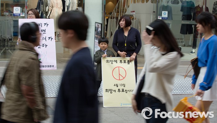(청주=포커스뉴스) 12일 오후 충북 청주시 성안길에서 충북시민사회단체연대회의 구성원들이 충북도민 투표참여 촉구 기자회견 및 거리 캠페인을 벌이고 있다.