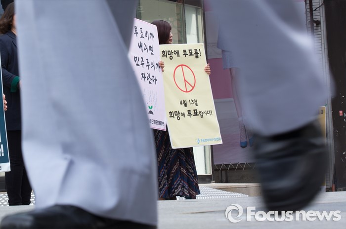 (청주=포커스뉴스) 12일 오후 충북 청주시 성안길에서 충북시민사회단체연대회의 구성원들이 충북도민 투표참여 촉구 기자회견 및 거리 캠페인을 벌이고 있다.