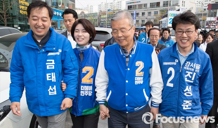 (서울=포커스뉴스) 2016 제20대 국회의원선거를 하루 앞둔 12일 오후 서울 강서구 발산역 인근에서 김종인 더불어민주당 비대위 대표 겸 선대위원장이 금태섭 강서갑 후보, 진성준 강서을 후보, 한정애 강서병 후보와 유세를 마치고 이동하고 있다.