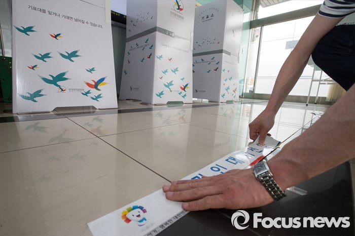 (서울=포커스뉴스) 4.13총선을 하루 앞둔 12일 오후 서울 성북구 보험연수원에 마련된 보문동 제2투표소에서 투표사무원이 안내대기선을 설치하고 있다.