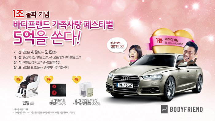 바디프랜드는 이번 행사를 통해 총 406명에게 5억원 상당의 경품을 증정할 계획이다. 추첨을 통해 선정된 1등 당첨자에게는 6250만원을 호가하는 '아우디 A6'(1명)를, 2등은 430만원 상당의 바디프랜드 프리미엄 안마의자 '팬텀'(5명)을 경품으로 증정한다.