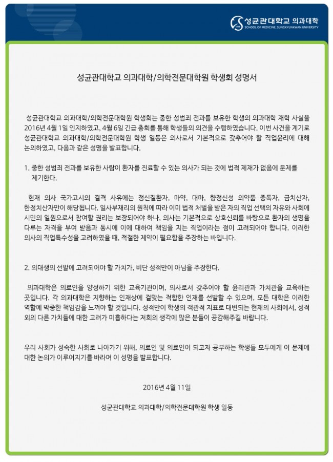 성대 의대 등 학생회는 "중한 성범죄 전과를 보유한 사람이 환자를 진료할 수 있는 의사가 되는데 대해 법적 제재가 없음에 문제를 제기한다"는 내용의 성명을 12일 발표했다.