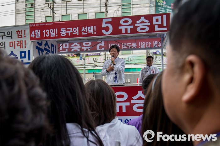 (대구=포커스뉴스) 유승민 무소속 대구 동구을 후보가 12일 오후 대구광역시 동구 방촌시장에서 유세를하며 유권자들에게 한 표를 호소 하고 있다.