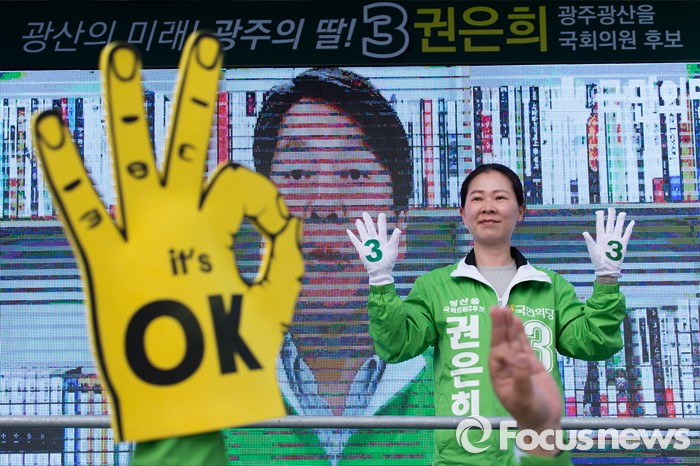 (광주=포커스뉴스) 4.13총선을 하루 앞둔 12일 오후 광주 광산구 타이어테크 수완점 앞에서 권은희 국민의당 광산구을 후보가 선거유세를 하고 있다.
