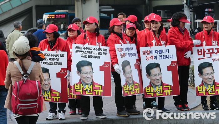 (서울=포커스뉴스) 4.13총선을 하루 앞둔 12일 오후 서울 영등포구 당산역 인근에서 선거운동원들이 박선규 새누리당 영등포갑 후보의 유세 준비를 하고 있다.