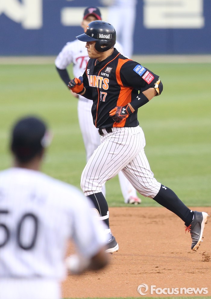 (서울=포커스뉴스) 12일 서울 잠실구장에서 열린 2016 프로야구 롯데-LG 경기 1회초 2사 2루에서 롯데 강민호가 좌얼 2점 홈런을 치고 베이스를 돌고 있다. LG 투수 소사가 강민호를 바라보고 있다.