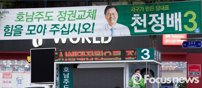 (광주=포커스뉴스) 4.13총선을 하루 앞둔 12일 오후 광주 서구 화정동 염주사거리에서 천정배 국민의당 광주 서구을 후보가 선거유세를 하고 있다.