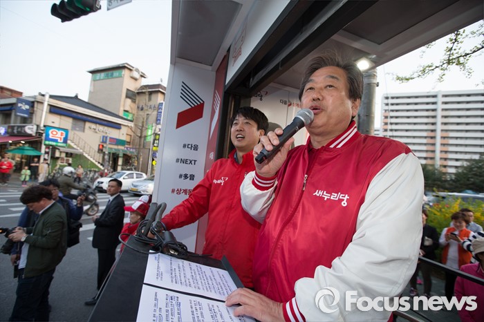 (서울=포커스뉴스) 12일 오후 서울 노원구 GS수퍼마켓 상계점 앞에서 김무성 새누리당 대표가 이준석 새누리당 노원병 후보자 지원 유세를 하고 있다.