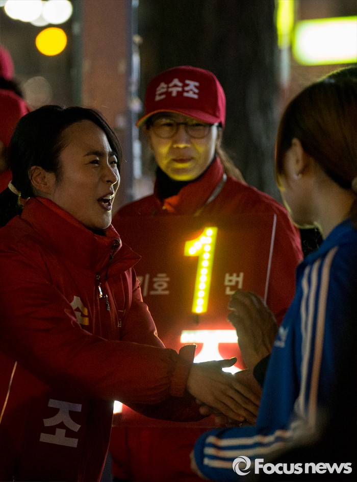 (부산=포커스뉴스) 4.13총선 선거운동 마지막날인 12일 오후 부산 사상구 엄궁초등학교 인근에서 손수조 새누리당 부산 사상구 후보가 지지자들과 악수하고 있다.