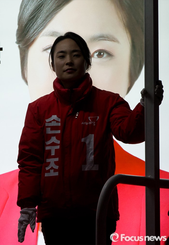 (부산=포커스뉴스) 4.13총선 선거운동 마지막날인 12일 오후 부산 사상구 엄궁초등학교 인근에서 손수조 새누리당 부산 사상구 후보가 유세를 앞두고 유권자들을 바라보고 있다.