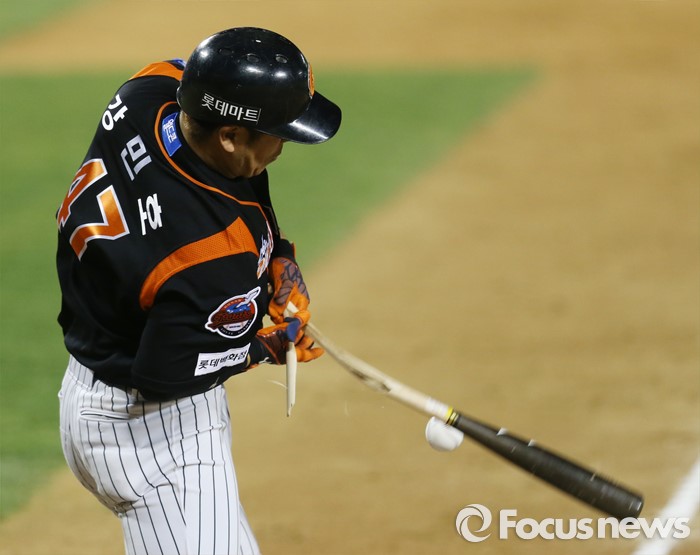 (서울=포커스뉴스) 12일 서울 잠실구장에서 열린 2016 프로야구 롯데-LG 경기 4회초 롯데 선두타자로 나온 강민호의 타격도중 배트가 부러지고 있다. 강민호는 4회 한 타석에서 두 개의 배트를 부러뜨렸다.