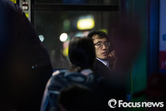 (서울=포커스뉴스) 공식 선거운동이 끝나는 12일 오후 퇴근길 한 시민이 서울 강남구 수서역 앞에서 유세를 벌이는 전현희 더불어민주당 후보를 바라보고 있다.