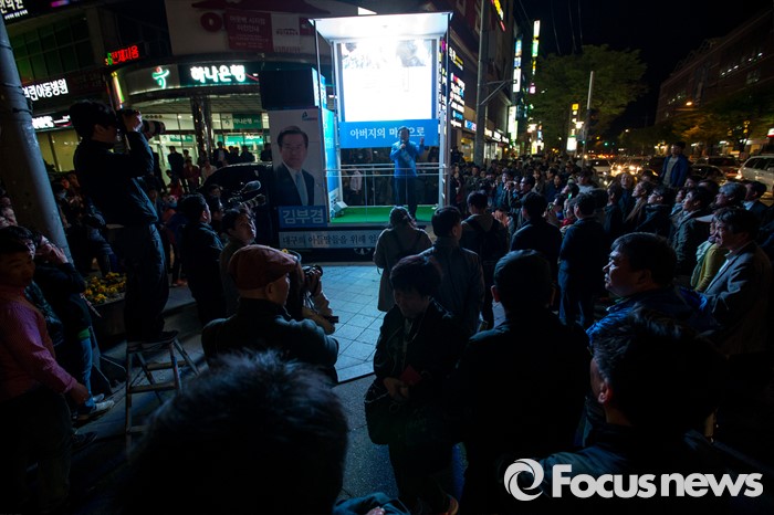 (대구=포커스뉴스) 김부겸 더불어민주당 수성구갑 후보가 12일 오후 대구광역시 수성구 신매네거리에서 유세를하며 유권자들에게 한 표를 호소 하고 있다.