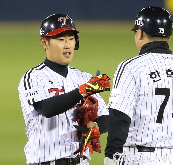(서울=포커스뉴스) 12일 서울 잠실구장에서 열린 2016 프로야구 롯데-LG 경기 6회말 1사 1루에서 LG 정주현이 좌익수 왼쪽으로 빠지는 1타점 동점 2루타를 치고 한혁수 코치와 주먹을 마주치고 있다.