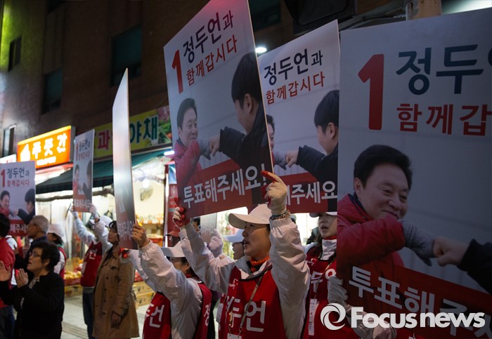 (서울=포커스뉴스) 제20대 국회의원 선거를 하루 앞둔 12일 오후 서울 은평구 증산역 앞에서 정두언 새누리당 서대문을 후보 선거운동원들이 구호를 외치고 있다.