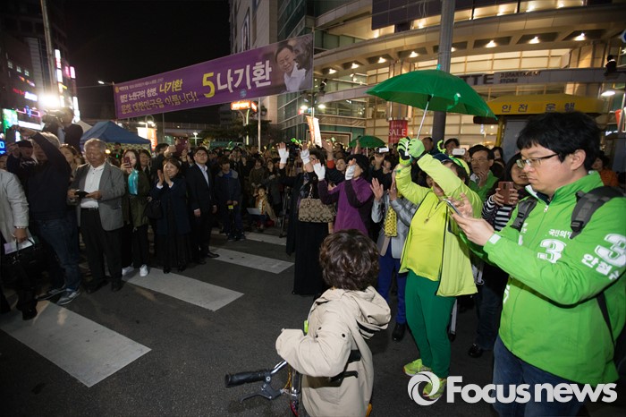 (서울=포커스뉴스) 4.13총선을 하루 앞둔 12일 오후 서울 노원구 롯데백화점 정문 앞에서 시민들이 안철수 국민의당 상임공동대표의 선거 유세를 지켜보고 있다.