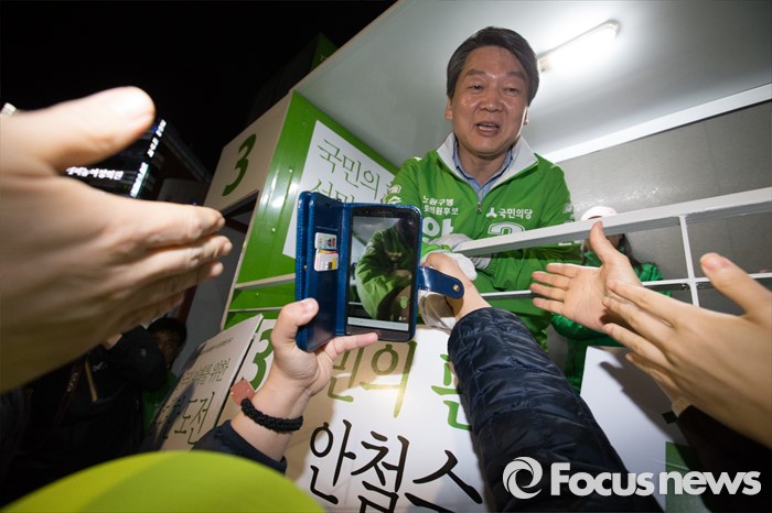 (서울=포커스뉴스) 4.13총선을 하루 앞둔 12일 오후 서울 노원구 롯데백화점 정문 앞에서 안철수 국민의당 상임공동대표가 막바지 선거 유세를 하고 있다.