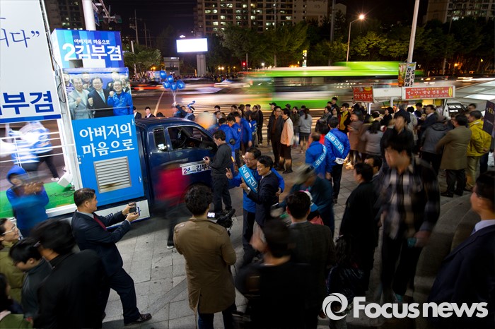 (대구=포커스뉴스) 김부겸 더불어민주당 수성구갑 후보가 12일 오후 대구광역시 수성구 신매네거리에서 유세를하며 유권자들에게 한 표를 호소 하고 있다.