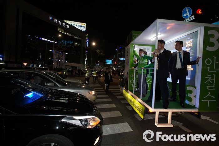 (서울=포커스뉴스) 4.13총선을 하루 앞둔 12일 오후 서울 노원구 롯데백화점 정문 앞에서 안철수 국민의당 상임공동대표가 막바지 선거 유세를 마친 뒤 유세차량을 타고 이동하고 있다.