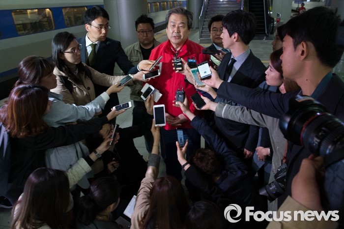 (서울=포커스뉴스) 20대 총선을 하루 앞둔 12일 오후 서울 용산구 서울역 KTX 플랫폼에서 김무성 새누리당 대표가 부산으로 가기 전 기자들의 질문을 받고 있다.