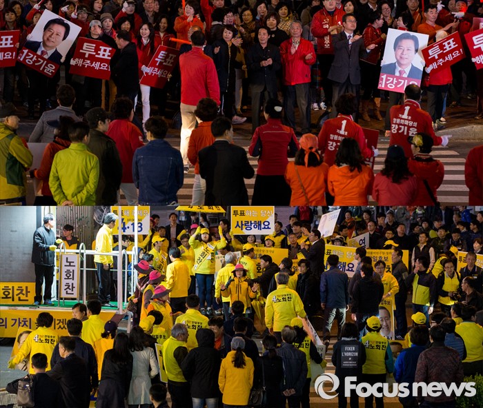 (창원=포커스뉴스) 4.13총선 선거운동 마지막날인 12일 오후 경남 창원시 상남분수광장에서 강기윤 새누리당 창원 성산구 후보(위), 노회찬 정의당 후보 지지자들이 막판 선거유세를 벌이고 있다.