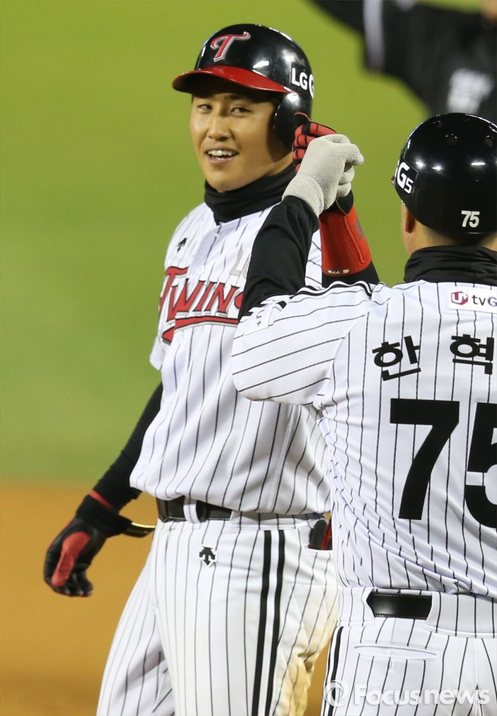 (서울=포커스뉴스) 12일 서울 잠실구장에서 열린 2016 프로야구 롯데-LG 경기 6회말 2사 만루에서 LG 채은성이 유격수쪽 내야안타로 타점을 올리고 1루에서 한혁수 코치와 주먹을 마주치고 있다.
