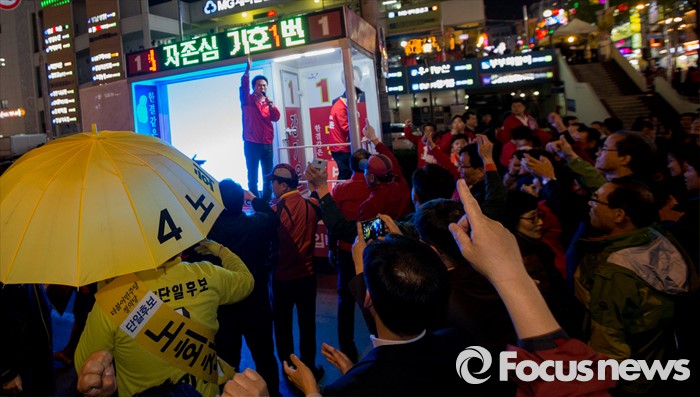 (창원=포커스뉴스) 4.13총선 선거운동 마지막날인 12일 오후 경남 창원시 상남분수광장에서 노회찬 정의당 창원 성산구 후보, 강기윤 새누리당 후보 양측 지지자들이 뒤엉켜 혼잡을 빚고 있다.