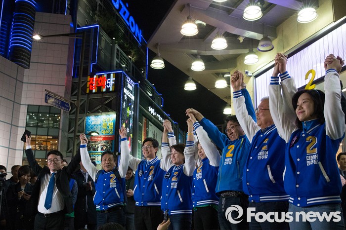 (서울=포커스뉴스) 20대 총선을 하루 앞둔 12일 오후 서울 중구 신평화시장 일대에서 김종인 더불어민주당 비상대책위원회 대표를 비롯한 비례대표 후보들과 마지막 선거유세를 하고 있다.