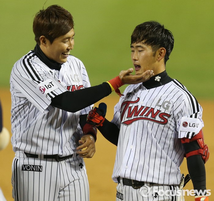 (서울=포커스뉴스) 12일 서울 잠실구장에서 열린 2016 프로야구 롯데-LG 경기 연장 10회말 1사 만루에서 중견수 희생플라이로 경기를 끝낸 LG 정주현을 동기인 채은성이 턱을 만지며 축하해주고 있다.